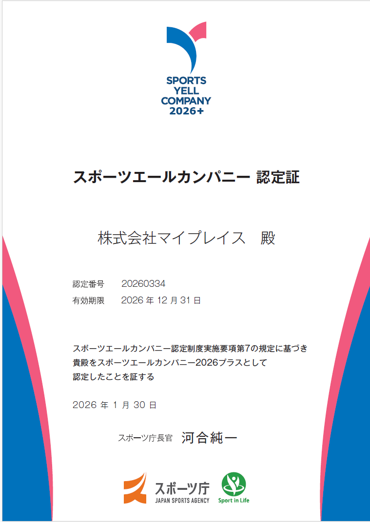 株式会社マイプレイスは、昨年に続き、スポーツ庁が推進する「スポーツエールカンパニー2026プラス」に認定されましたのでお知らせいたします。